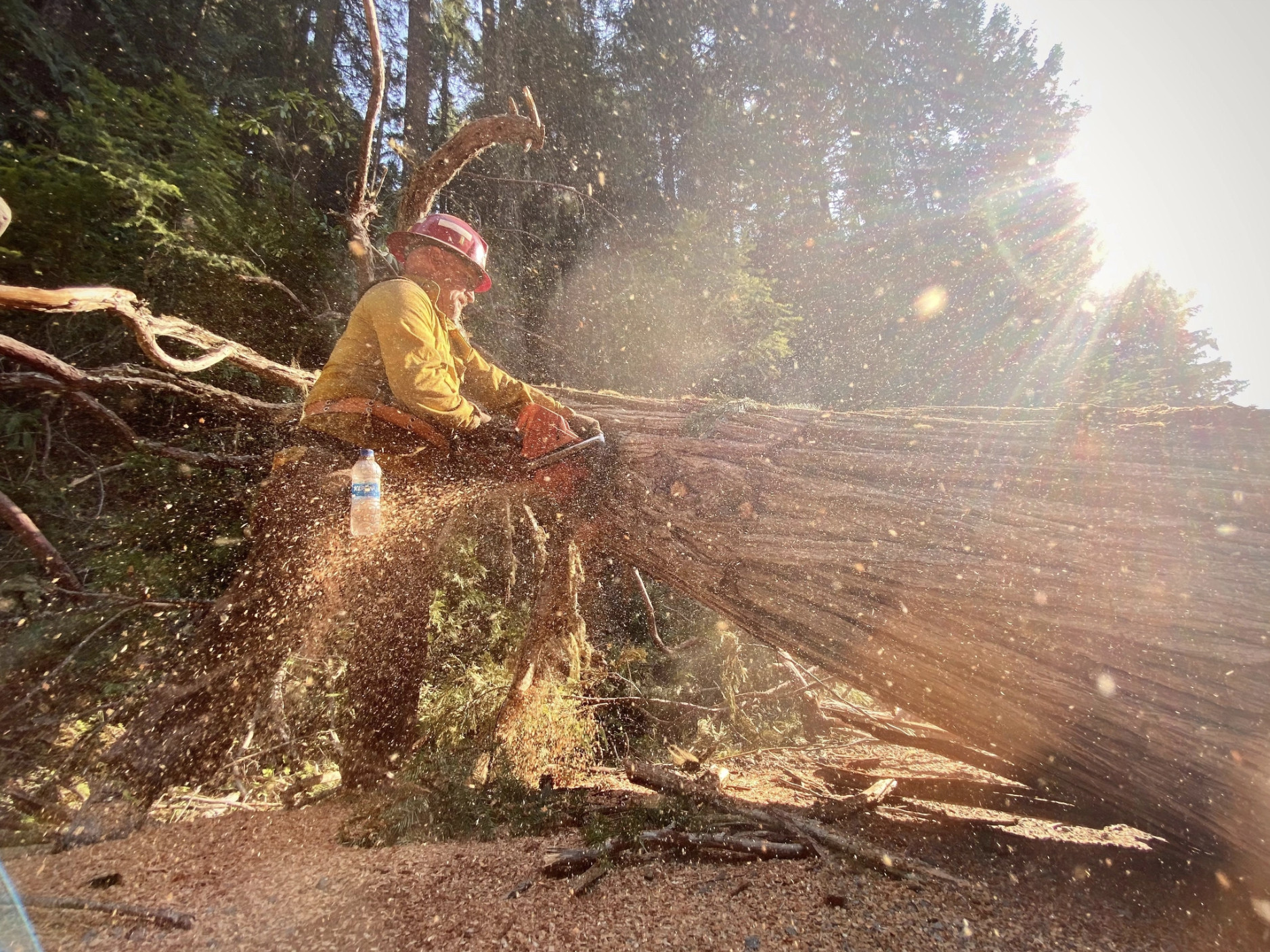 Crew member breaking down the componets of a fallen tree