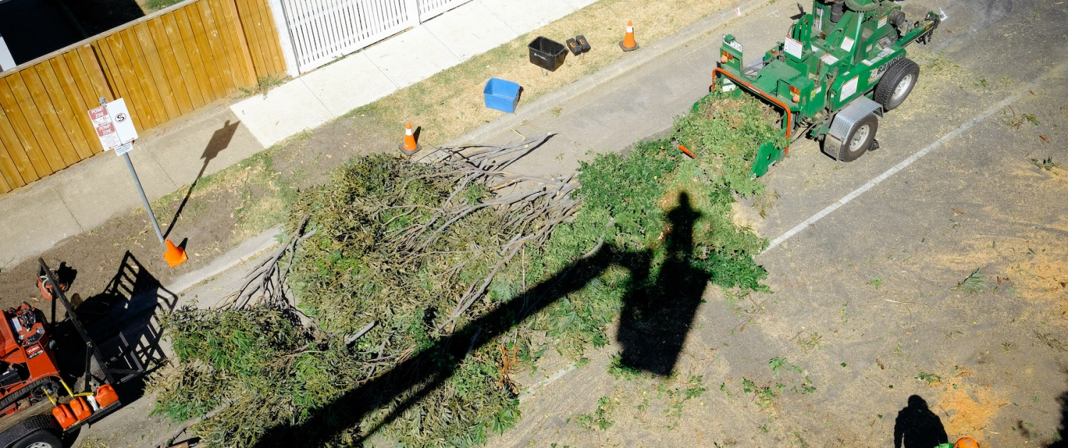 Once the trees have been cut down and removed, the team then brings on the industrial stump grinder and wood chipper. The stump grinder uses a powerful blade fitted with tungsten teeth to tear through the wood of the stump to below the surface of the soil. This clears the land and cuts off the root system, causing it to decompose without having to unearth the land to remove it. Once this process is complete, our tree loppers will feed the fallen trees and green waste through the woodchipper. By doing so they can quickly turn the large sections of wood into small pieces that can be easily transported and even used as fresh wood chip mulch.